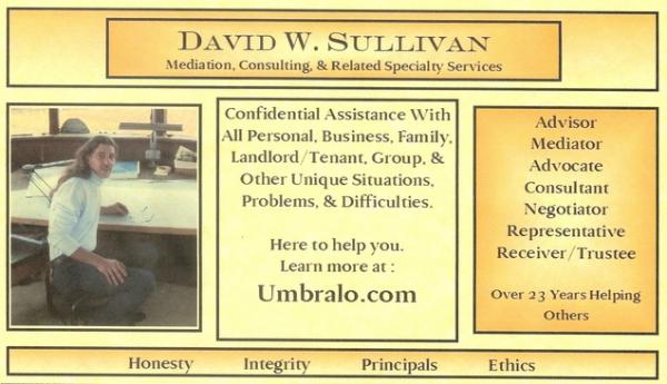 My name is David W. Sullivan and this web site is a place for me to express and share who and what i am and what I do (& why ?), a place for friends, associates, and organizations to do the same and a place for others to learn about and find help and support services that are uniquely suited to assist them as their life's situations require. |